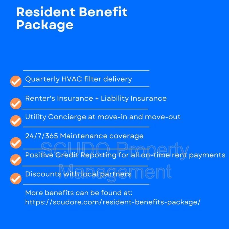 - $32.99/mo SCUDO Resident Benefit Package. This is NOT rent See everything that is included in your Resident benefit package here: https://scudore.com/tenant-benefits-package/. [Only 1 benefit package per home required]