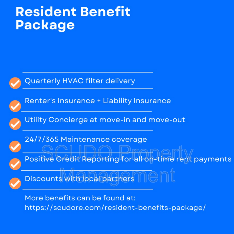 - $32.99/mo SCUDO Resident Benefit Package. This is NOT rent See everything that is included in your Resident benefit package here: https://scudore.com/tenant-benefits-package/. [Only 1 benefit package per home required]