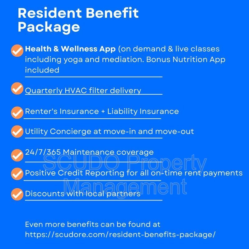 - $34.99/mo SCUDO Resident Benefit Package. This is NOT rent See everything that is included in your Resident benefit package here: https://scudore.com/tenant-benefits-package/. [Only 1 benefit package per home required]